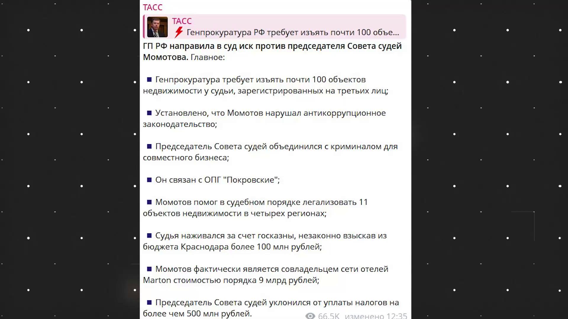 Ничего удивительного для современной России.. просто председатель Верховного суда корешился с ОПГ, имел сеть гостиниц и прочее.. Кто не в курсе, то Верховный суд является высшей судебной инстанцией, и его возглавлял вот этот гражданин Момотов. Надо ли говорить о том, что может происходить ниже по судебной лестнице в регионах? Добавлено: 6 октября 2025 в 02:58Категория: Новости и политика Теги: Генпрокуратура, 9 лярдов, председатель, верховный суд, Виктор Момотов, судьи, никто не виноват, коррупция, система, ЛенТВ24 Похожее видео